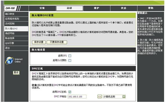 启动DMZ映射即将某个LAN口与WAN口对应起来,如果WAN口接收到数据,则自动转到该LAN口。也即将该LAN口完全暴露在路由器之外,如图6所示。DMZ IP地址指的是某指定LAN口的IP地址,比如为.