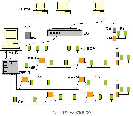 就我们企业来讲,由于近年来水资源日益匮乏,节水工作日趋重要。为了节水降耗,我们企业于98年实施了水计量检测系统。该系统除了上层网络外,全部采用了串行通讯技术实现联网。其中数据采集设备包括主采站、串行通讯控制模块(作分站)、多串口通讯卡、具有RS485的流量仪表、串口数传电台(RS232)、RS485/422通迅中继器。组成了如图1所示的数采系统。