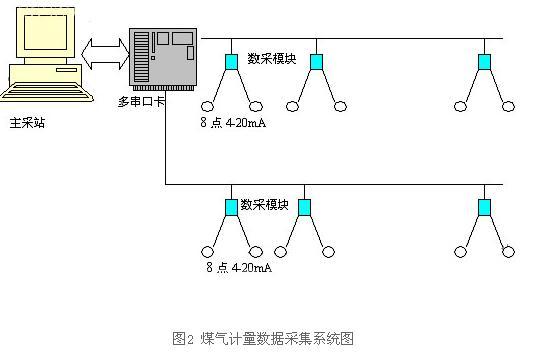 水计量数采系统投入运行后,我们企业又实施了煤气计量数采系统。实施煤气计量数采系统不仅是为了是煤气数据可以进行实时检测,主要原因是因为企业内部所生产的煤气种类多样,利用计算机进行数据采集,对流量数据可以进行温度、压力补偿,还可以根据不同煤气的不同热值情况进行补偿。煤气计量系统与水系统所不同的是,煤气系统采用近20块8路A/D数采模块,接收常规仪表的4-20mA信号,通过RS485与上位机进行连接,组成串行系统通讯网络。系统共有50多个采集点的温度、压力及热值数据,覆盖范围约3千米。系统投运以来运行稳定可靠。该系统数采部分的网络结构如图2所示。