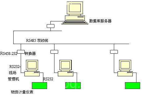 在物资运营计量方面,很多冶金企业的也都进行的联网,但网络连接结构都不大相同。物资计量网的下层一般都采用RS232连接物资计量仪表和上位机,这一层物理连接方式大都一致。将各个计量站的上位机进行联网并将数据汇总到服务器的上层联网方式就各有不同了。有些上层网也采用RS485串行通讯方式,但这种方式规模不宜过大,而且地理位置也不宜太远。该方式如图3所示。