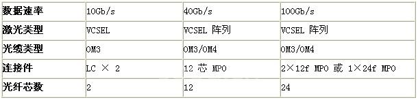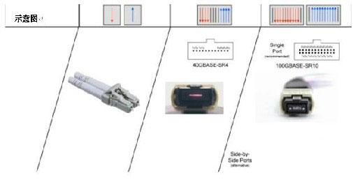 上图说明了100G以太网的几种不同接口,其中首选方案是单个24芯MPO连接件,或者也可用两个12芯连接件构成信道,连接件垂直或并排配置。