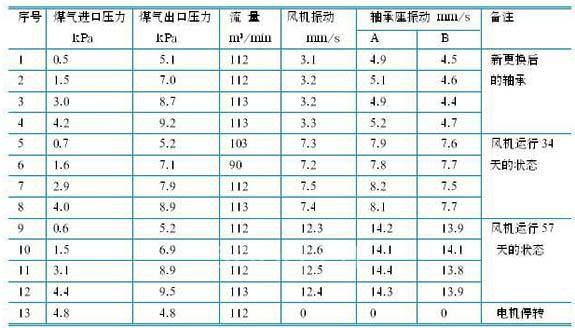 注: 1、a项为负载端轴承座的径向振动值;b项为风机拖动端轴承座振动值。2、风机轴承座振动超过13mm/s时,轴承温度升高到75℃以上,就会引起轴承座震裂、轴承抱死和风机叶轮出现裂纹等后果,故在日常点检中,当检测到其振动达到12mm/s时,就采取重点监护运行,并及时安排检修工作。