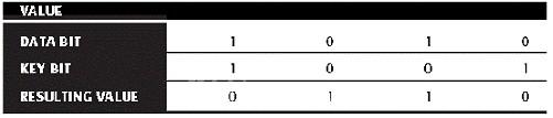 为了更好地理解WEP过程,你需要理解布尔逻辑的基本原理。特别是你需要理解异或(Excusive OR, XOR)的用法。XOR只是一个简单的2比特位之间的二进制比较,它的结果是另一个比特位。当比较2个比特位时,XOR检查它们是否不同。如果不同,XOR的结果就是1。如果相同,结果就是0。表9-2说明了一个XOR运算的例子。