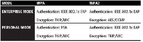 早在2004年,无线安全性的长期解决方案在WPA2发布后被认证通过。这就是802.11i组曾经致力于开发的标准。它设计上使用了高级加密标准(Advanced Encryption Standard,AES)。AES要求比RC4更多的处理能力,它是包含在原来的802.11设计中的。现在有最多256位的密钥长度,这是大大改进了原来WEP使用的40位加密方式。表9-3说明了通用的模式以及WPA和WPA2的种类。