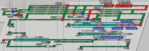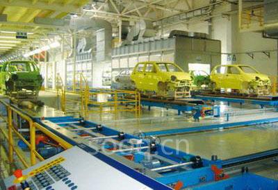 汽车涂装车间的设备按工艺来分一般有:工艺设备、机械化输送设备、自动喷涂机(机器人),对于机械化输送设备按设备特点分一般有:升降机、高温工艺链、常温工艺链、横移机、转台、滚床等。奇瑞汽车有限公司涂装二车间是由德国杜尔公司总包建设,整条生产线从德国进口,由杜尔公司承担设计、制造、安装、调试。前处理线、电泳线采用RoDip-3运输系统,PVC线、中涂、面漆线采用双排工艺输送链+滚床+升降机+带旋转台移行机等输送设备组成。图1 为涂装二车间输送设备其中一个层面,此生产线为亚洲第5条生产线,在国内只有2条,拥有现代化的生产设备,变频器在其输送系统中有着非常重要的作用。