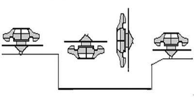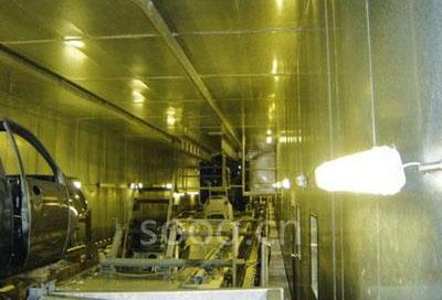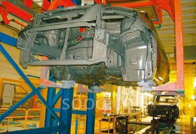 前处理和电泳线输送系统一般有自行葫芦、C型钩、RoDip-3等输送方式。而RoDip-3系统是目前国际上最先进的涂装前处理、电泳运输系统之一,因为RoDip-3能实现车身在槽内360o翻转(如图4所示),对车身电泳质量起到很好的效果。首先,车身是以翻转的方式进入槽液的,这样在车身入槽时,槽液能快速地进入车身,而且能够避免出现气囊现象;其次,车身在槽内的摆动只需要通过一个小的导向轨道就可实现;再次,RoDip-3是直接以翻转的方式进入槽内的,这样就节约了工艺设备的长度。电泳RoDip-3设备如图5所示。