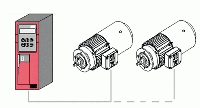 在车底遮蔽工位,UBS吊具主要用于承载车身,带着车身在工位上运行。悬置滚床通过几个钢柱吊点与室体顶部相连,将滚床悬吊在空中。悬置滚床由驱动电机、滚轮、齿形皮带、钢结构组成。机械结构上一共由7个电机驱动7个滚床,工作时7个电机要同步运行,为了实现此目的及节约投资成本,杜尔公司在这里采用了变频器“一拖几”的方式,由1台变频器控制7台电机运行,如图6所示。这样不但解决了其控制环节复杂,相互之间联锁关系多的问题,还同时能够达到变频调速的功能。