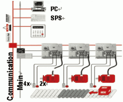 涂装车间的输送方式一般有地面链、滚床等输送等方式,滚床因为维护方便、控制速度容易而被广泛应用,在整个汽车涂装车间里滚床数量最多、分布最广。在此,我们选用了SEW公司的MOVIMOT变频器用于现场分散安装、控制,如图7所示。