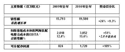 对于2011年,我们的目标确定为:销售额稳定增长,有机增长率达到6%至9%,EBITA盈余为销售额的15.0%至15.5%,预计比2010年14.5%的水平有所提升。”