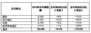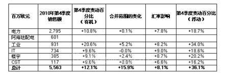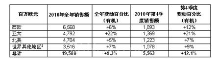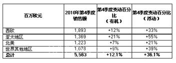 2010年第4季度销售额达到55.63亿欧元,按目前浮动结构和汇率计算,增长36.1%。销售额同比增长12.1%。