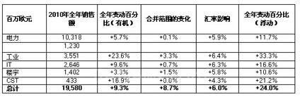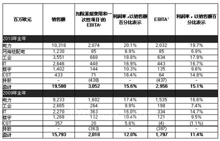 按业务划分,电力领域的盈余较前一年提高了2.7个百分点,达到销售额的20.1%。工业领域的盈利能力跳升了8.9个百分点,占销售额的18.8%。IT继续了其盈余逐步增长的走势,上升0.9个百分点,占销售额的16.9%。CST实现的最好的盈余改善,提高了10.8个百分点,达到销售额的16.4%,这要归功于销售量反弹和持续的重组工作。楼宇业务的盈利能力与前一年基本持平,占销售额的10.3%。