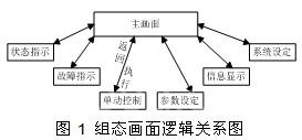本文采用Protool V6.0进行触摸屏画面组态,根据斗轮机设备需要及特性,画面设计总体分为一个主画面、六个子画面,其逻辑关系如图1所示:
