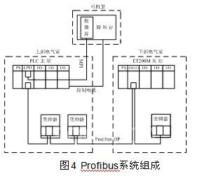 根据斗轮堆取料机电气控制系统的特点,分别在上部电气室和下部电气室配备Profibus-DP主站和从站,触摸屏设置在司机室,以方便司机操作及故障查询。 上部电气室选用西门子S7-300 CPU315-2DP可编程控制器作为主站,CPU315-2DP本机具有1个MPI接口和1个DP接口,从站设在下部电气室,从站I/O 模块选用ET200M,选用IM153-1 通讯接口模块。大车行走、悬臂变幅及回转机构通过变频器来控制,变频器作为从站通过CBP2通讯板(Profibus通讯模块)连接在系统总线上。系统硬件配置如图4所示: