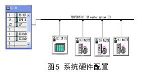 PLC编程软件采用西门子SIMATIC STEP7 V5.4。启动软件后,进行硬件组态,选中SIMATIC300(1),双击右边窗口中的“硬件”图标,组态其硬件。将所选CPU和各输入、输出模块插入 SIMATIC S7网络,并定义各模块I/O地址。依次将IM153-1、变频器挂到Profibus网络,设置PLC 为主站其地址为( 2) , ET200M为从站,其地址设置为( 3) (注意设定地址须和ET200M硬件上拨码数字相同) , 行走变频器, 回转变频器, 变幅变频器地址分别设置为( 4) ( 5) ( 6) 。变频器的从站地址必须与PROFIBUS 主站上配置的地址相一致, 且总线上每个单元的地址必须是唯一的PLC 主站中的用户程序存取, 经过总线系统的通讯是完全由PLC 主站中的主接口和IM153-1接口进行处理。PLC 主站将数字量信号通过PROFIBUS-DP 总线经PROFIBUS 模块传送至变频器, PROFIBUS 模块安装在变频器的正面,通过RS485 串行接口与变频器通讯。其配置图如图5所示: