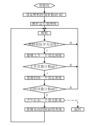 在堆料PLC 半自动控制程序中, 首先将大车预制在预定堆煤位置, 通过可编程终端画面上的堆料控制参数设定, 设定堆料时悬臂架的变幅次数M1次和悬臂架回转次数M2次。启动堆料程序, 则悬臂胶带、尾车胶带在程序的控制下顺序逻辑启动, 给系统发出斗轮堆料作业信号并实现与系统胶带按堆料工况联锁。堆料机在堆料位自动运行状态堆料,随着物料的堆积,料堆逐渐升高,当物料碰到斗轮机上的物料开关时,悬臂上升一个高度,如此为上升设定的M1 次。悬臂左回转一个角度, 重复以前堆料,直至回转设定M2次。大车后退一段距离, 悬臂向右回转M2 倍角度,堆料M1次、回转M2 次。大车再后退, 重复工作,实现斗轮堆取料机的堆料PLC控制作业。其控制流程图如图6所示: