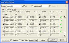 如图所示,首先在导入的工件数学模型上选择适当的基准面上的表面点(对应工装上的定位面)和基准孔中心(对应工装上的定位销),然后依次测量工件上的这些基准元素位置,得到拟合计算的结果。如果定位基准属于过定位,通过分析结果数据,可以知道基准之间存在哪些冲突,然后再决定是否应该舍弃某些可能存在问题的基准(通过放弃某些拟合计算约束条件来实现),这种复杂拟合建坐标的功能使得激光跟踪仪可以代替各种机械工装检具来检测白车身和冲压件。具体方法是,首先固定好零件,选择工装检具检测时的定位元素(包括定位面和定位销)作为建坐标的参考基准,这样拟合得到的工件坐标系,就准确再现了机械检具检测时使用的工件坐标系,此时测量出的工件偏差和机械检具检测出的偏差数据一致,能准确反映工件的实际状态。这就是所谓的“电子工装”技术。白车身、焊装夹具、检具的检测需要遵循的原则就是,建坐标的基准和实际工件的安装定位基准或者工作基准保持一致,这样才能最大限度的减小测量坐标系带来的误差。采用这种基于数学模型的“电子工装”技术,在节省下制造机械工装的高额成本的同时也省去了对这些机械工装进行检测和维护的人力资源,可以大大提高生产效率。
