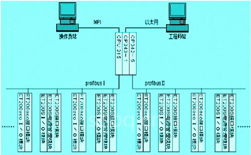 本系统采用PLC300CPU和CP342-5、CP343-1的接口模块相连构成系统的主站。CP342-5是用于连接S7-300和 profibus-DP的主/从站接口模块,CP 343-1是用于连接S7-300和工业以太网的接口模块。在该控制系统中,除了上述主站外,从站是由 22个ET200S和22个ET200eco组成,分别分布在两条profibus网络上。CPU上自带的profibus-DP接口构成 profibusⅠ线,CP 342-5接口模块构成profibusⅡ线。