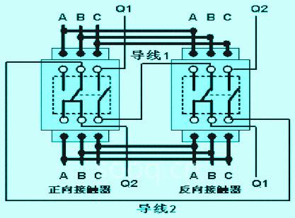 (2)关于接触器的硬件互锁。对于转台工位,转台有正转和反转两种工作状态,因此转台的回转电机需要有一个负荷开关和两个接触器一并来控制(而举升电机一般只需要一个负荷开关和对应的一个接触器即可进行控制),接触器分正转接触器和反转接触器,输入端为380AV。正转接触器的三相电压A、B、 C分别和反转接触器的C、B、A短接。如图2所示,当程序在执行过程中,若存在某些漏洞使得正转接触器和反转接触器的输出点同时置1时,则会出现正转接触器和反转接触器各自的A相和C相短接,造成接触器短路损坏,主电源开关跳闸。为了避免这种事故的发生,首先保证程序中不能出现两个接触器同时置1的情况,其次即是采用接触器上硬件互锁,如图2所示,点Q1、点Q2是输出控制点,Q1两端本应接在正向接触器的两个输入端子,同理, Q1两端本应接在正向接触器的两个输入端子,但是改接成如图所示。接触器上有自带的一个常开点和一个常闭点,互锁中只需用到常闭点,当输出点Q1闭合时,正向接触器上常闭点随之断开,则Q2输出点两端之间不可能形成回路,也就不会出现短路跳闸的事故。