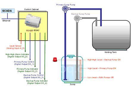 更好的选择是使用闭环控制中央监测监控系统(SCADA 系统)。在这种情况下,使用传感器连接到控制器以控制泵的开启和关闭,传感器用来检测水位,控制器用来控制水泵的运转。当传感器检测到水位达到高位或者低 位的时候,应当触发本地的报警机制,并开启或者关闭水泵。而且水泵控制还必须实现远程手动控制或者本地的自动控制。