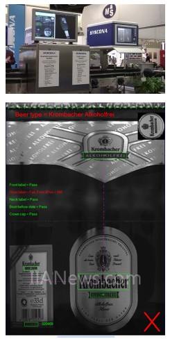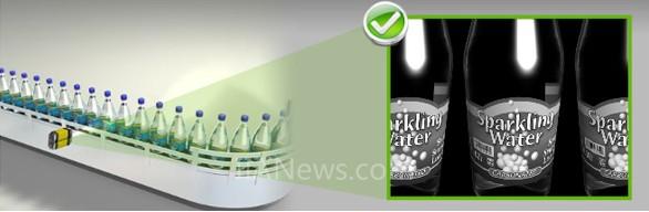 这些高分辨率的影像接着由康耐视一系列的尖端影像工具精密分析,检查位于瓶颈、瓶身正面、背面的卷标是否完好,位置是否正确,并检查瓶盖边缘波纹、商标,以及瓶盖位置。