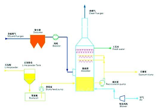 锅炉烟气经电除尘器除尘后,通过增压风机、进入吸收塔, 在吸收塔内烟气向上流动且被向下流动的循环浆液以逆流方式洗涤。循环浆液则通过喷浆层内设置的喷嘴喷射到吸收塔中,以便脱除SO2、SO3,与此同时在“强制氧化工艺”的处理下反应的副产物被导入的空气氧化为石膏,并消耗作为吸收剂的石灰石。循环浆液通过浆液循环泵向上输送到喷淋层中,通过喷嘴进行雾化,可使气体和液体得以充分接触。每个泵通常与其各自的喷淋层相连接,在吸收塔中,石灰石与二氧化硫反应生成石膏,这部分石膏浆液通过石膏浆液泵排出,进入石膏脱水系统。经过净化处理的烟气流经两级除雾器除雾,在此处将清洁烟气中所携带的浆液雾滴去除。同时按特定程序不时地用工艺水对除雾器进行冲洗。在吸收塔出口,烟气一般被冷却到46~55℃左右,且为水蒸气所饱和。通过加热器将烟气加热到80℃以上,以提高烟气的抬升高度和扩散能力。最后,洁净的烟气通过烟道进入烟囱排向大气。