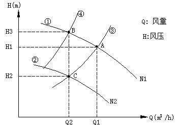 曲线①为风机按转速N1工作时的特性曲线,曲线②为风机按转速N2工作时的特性曲线,③④为风道阻力曲线。