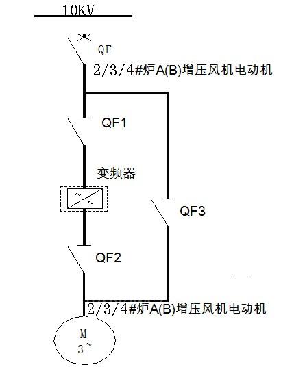 基本原理:它是由3组高压开关柜QF1、QF2和QF3组成。要求开关柜QF2和QF3不能同时闭合。变频运行时,开关柜QF1和QF2闭合,开关柜QF3断开;工频运行时,开关柜QF3闭合,开关柜QF1和QF2断开。