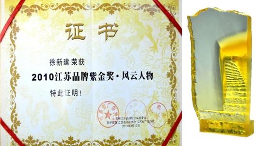 4月10日,首届江苏品牌紫金奖暨“25年,品牌照耀江苏”大型主题调查活动颁奖典礼在南京举行。省人大常委会副主任丁解民、省长助理徐南平等共同揭晓了两大系列12个榜单所有奖项,品牌调查结果同时公布。太阳雨太阳能集团董事长徐新建荣膺 “首届江苏品牌紫金奖十大风云人物”。同时获得此荣誉的还有华西村老书记吴仁宝、波司登集团总裁高德康等10位为江苏经济社会作出卓越贡献的行业领袖。