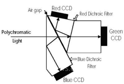 3CCD彩色摄像机,这种摄像机每个像素点对应有R、G、B三个感光元件,采用分光棱镜将入射光线分别折射到三个CCD靶面上,分别进行光电转换得到R、G、B三色的数值(见下图)。这种摄像机得到的图像质量好,没有细节丢失的问题,但由于摄像机结构复杂,所以一般较昂贵。另外由于这种摄像机采用了分光棱镜的方式,光线到达每个CCD靶面的光程是不一样的,所以需要镜头做针对性的设计才能达到比较好的图像效果,所以使用3CCD的摄像机还需要配备专用的镜头。