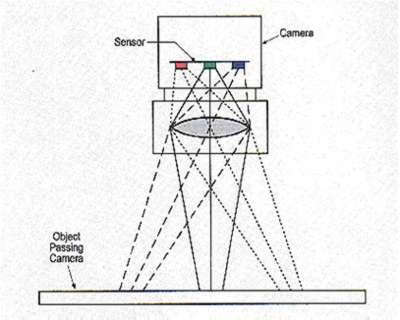 3Line彩色摄像机,该摄像机的具有R、G、B三行像元,分别对红、绿、兰三种波长的光敏感,所以每个像素点都会对应R、G、B三个通道的数值,形成彩色的图像数据。需要注意的是,由于R、G、B三行像元在同一时刻所采集的并非同一位置的信息(见图),在实际应用中需要进行运动校正才能得到所需的彩色图像。一般的摄像机都提供内部进行运动校正处理的功能,但对于对比度非常高的图像边缘还是容易出现色彩失真的现象。