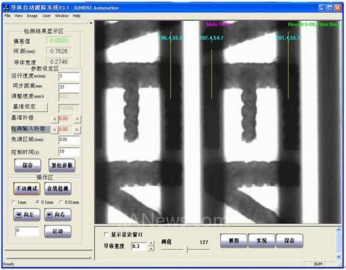 本系统用于连续实体动态图像的识别、测量和动态跟踪,广泛用于带状产品的精密测量、加工,例如FFC(软电缆排线)加工、丝带印刷等。当产品沿运动方向连续运动时,本系统可以动态测量中间实体的宽度和位置,指示执行机构跟踪实体进行加工。系统图象识别精度0.0065mm, 测量和执行精度为0.010mm。