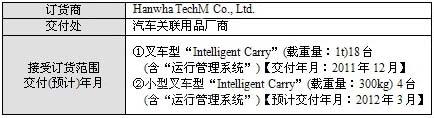 株式会社日立工业设备技术(总部:东京都丰岛区、取缔役社长:东原 敏昭/以下称“日立工业设备技术”)接受了大韩民国(以下称“韩国”)的产业机械制造商Hanwha TechM Co., Ltd.(总部:韩国昌原市、CEO:金南圭)于2011年9月发来的该国汽车关联用品制造商新建工厂用于生产线的22台自主走行型无人搬送车“Intelligent Carry”订单。本公司于2011年12月交付了18台。 余下尚未交付的4台,预计在2012年3月交付。“Intelligent Carry”是一种即使没有移动路线导向,也能在电子地图上边推定自己位置边按设定路线自主走行型无人搬送车。此次是首次向海外交付,且共计是22台的大型订单。