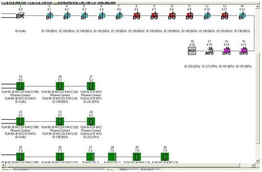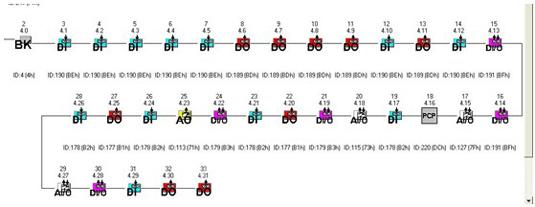 此次改造的目的是淘汰老化已停产的LOOP总线模块,将其全部更换为菲尼克斯电气目前的主流产品。S1线的ABB涂胶机器人外围共有15个LOOP总线模块,其中有6个安装在机器人端拾器上,其余的9个分别安装在前、后风窗和涂胶泵站上;根据这个特点,我们的改造方案是将前风窗、后风窗和涂胶泵站上的9个LOOP总线模块更换为FIELD-LINE总线模块,将机器人端拾器上的6个LOOP总线模块更换为无线模块。图1是改造之前机器人总线的CMD程序截图,可以看出从“4.17模块”到“4.31模块”一共15个模块都是使用的LOOP总线,而从“4.0模块”到“4.16模块”使用的都是菲尼克斯电气的IN-LINE总线(该总线模块属于通用型,没有停产的风险)。