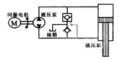 直接驱动电液伺服系统是用交流伺服电动机、可双向转动的定量泵取代了电液伺服系统中的伺服阀和变量泵。交流伺服电动机驱动 可双向转动的定量泵, 定量泵直接驱动油缸。通过改变电动机的正反转、电动机的速度、和运转时间来控制油缸的正反向、油缸速度的快慢和位置。直接驱动电液伺服系统的优点在于: