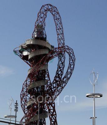 伦敦奥运会场馆的建设体现着环保的理念。图片是伦敦奥林匹克公园奥林匹克体育场外的光环桅杆。其中设置的风力涡轮构造可以进行发电,为圈状照明灯提供部分电力。