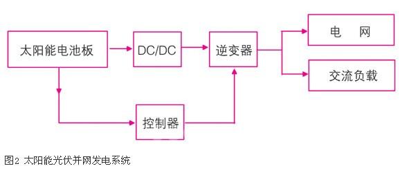 太阳能发电系统通过光电效应产生电能,所发的电能通过逆变器把直流电转换成交流电,并由控制器对电能进行调节和控制,如图2所示。在光照条件下,太阳电池组件产生一定的电动势,通过组件的串并联形成太阳能电池方阵,使得方阵电压达到系统输入电压的要求。再通过逆变器转换成交流电,交流电一部分输送到配电柜,由配电柜的切换作用进行供电,用于照明等用途,其余电能馈入电网。