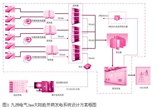 哈尔滨九洲电气新建厂区位于哈尔滨市松北区,本期项目为九洲电气科研楼屋顶光伏发电项目,预计安装容量为3mw。楼房建设凸现节能环保主题,屋顶安装光伏阵列,引出端经控制器和逆变器与公共电网相连接,为节约造价不安装蓄电池组,而是由光伏方阵和电网并联为公司提供电力,当光伏发电系统工作时,产生的电能通过转换作为公用部分照明及试验、生产用电,当有多余的电能产生时,则馈入电网。