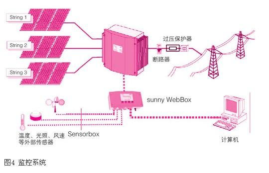 如图4所示,监控系统是以sunny webbox为总控单元,此系统可以连接最多50台并网逆变器,可以监控每台逆变器的日发电量,累计发电量等,同时系统配备环境传感器可以采集辐照量、温度、风速等信息为分析系统发电量提供依据。