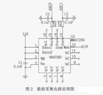本文选择飞思卡尔公司的硅电容加速度传感器MMA7260。它具有信号放大调理、低通滤波和补偿功能。该器件的零加速度偏置、满量程范围和滤波特性均由制造厂家调定,不需要外接无源元件。由于该传感器制作工艺上的高集成度和可靠性,最大程度地降低了外界的干扰。MMA7260直接采用IC集成封装,可直接焊在PCB板上,调试方便。
