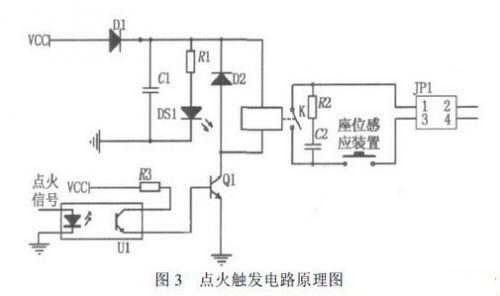 由于气囊气体发生器的点爆时需20mA电流脉冲。若直接用LM3S1138的I/O口输出高电平进行引爆,驱动过小,无法满足要求。系统选用电磁式继电器,在LM3S1138输出口的控制下可驱动大功率的负载。由于继电器会产生较明显的干扰,故在继电器周围加抗干扰电路的同时与光电耦合器配合使用,使得处理器与触发电路光电隔离。当碰撞发生时,安全气囊对身材过于矮小的成年人或儿童不但没有保护作用,引爆的巨大冲击力甚至会将其弹死。为了更好地实现安全点火和智能化点火,系统在触发回路上设置一个座位压力感应装置。如果有成年人入座,则装置闭合,点火电路可正常工作。相反,如果装置断开,则表明无人入座或只有矮小成年人或儿童入座,触发电路不能形成回路。此时,即使汽车发生碰撞且算法发出点火信号,安全气囊也不爆破。这样,既防止在无人入座的状态下引爆气囊而造成的经济损失,又避免了气囊对矮小成年人和儿童造成的伤害。点火触发电路的原理图如图3所示。