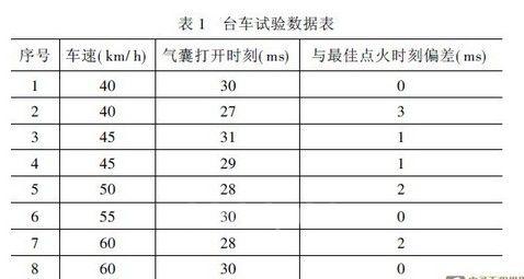 试验数据表明,气囊打开时刻与最佳点火时刻偏差很小,在此偏差内不会发生气囊弹伤乘员或过早漏气的现象。