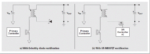 考虑到功耗大小问题,图1所示反向拓扑结构因其简单性和低成本成为我们的首选。二次侧肖特基二极管整流器(图1a)的传导损耗,成为实现高效率、紧凑型适配设计的一个限制因素。例如,在一个典型5-V/3-A适配器中,满负载条件下二极管整流器本身的功率损耗便可达到总系统损耗的30%到40%(忽略二次损耗对高一次侧损耗的综合影响)。为输出(图1b)安装一个同步整流器(SR),可以提高转换器的总效率,并且由于产生的热量更少(适配器设计中至关重要),因此系统热管理更加容易。