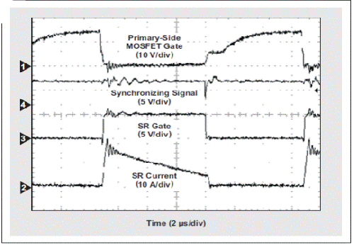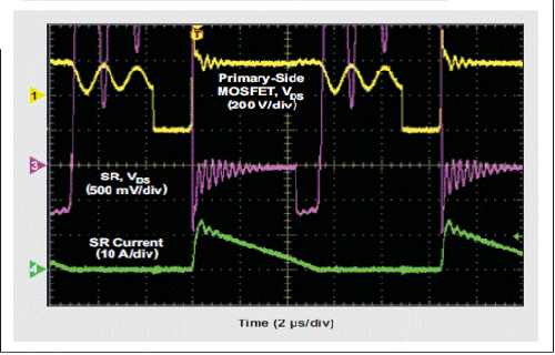 我们可以对反向转换器进行设计,让它可以根据终端应用要求工作在不同模式下。对于工作在连续导电模式(CCM)下的设计来说,变压器二次绕组的电流在一次侧MOSFET开启以前不会降至零,从而导致一定时间的交叉导电。在这类转换器中实现同步整流后,一旦一次侧开关开启SR MOSFET马上就要关闭,这点极为重要。这样可以防止出现反向导电,并控制额外功耗和器件应力。“绿色整流器”的同步功能检测到一次侧导通跃迁后,关闭SR MOSFET。图3描述了SR门关断跃迁现在如何受到一次侧同步信号的控制,而不受VDS检测的控制。