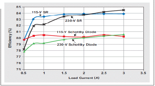 图 5 肖特基二极管与同步整流(SR)系统效率对比图