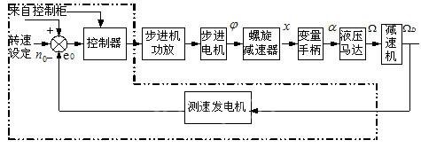 该系统主要由控制器,功放,步进电动机,螺旋减速器及变量手柄,液压马达,测速发电机组成,是一个闭环直流调速系统。如下图所示: