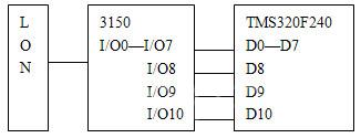 3150与TMS320F240采用并行通信[1]。3150的I/O0——I/O7与TMS320F240的D0——D7相联作为八位的数据总线;TMS320F240的D8与3150的I/O8相联,作为DSP请求发送数据的信号线和接收3150命令的应答线;D9与I/O9相联,作为神经元芯片接收数据的应答线;D10与I/O10相联,用作3150发送命令的信号线。