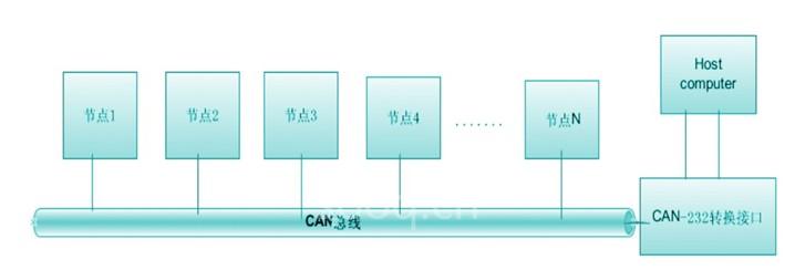 如图1所示,整个系统由3个部分组成,节点信息采集卡,can-rs232/485转换接口和监控计算机。