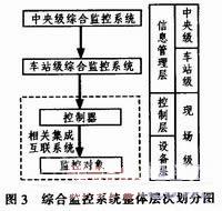 综合监控系统的监控对象主要是行车和行车指挥、防灾和安全、乘客服务等相关内容。为了满足两级制监控和调度指挥的需求,综合监控系统采用两级管理三级控制的分层分布式结构。两级管理分别是中央级管理和车站级管理,三级控制分别是中央级控制、车站级控制和现场级控制。综合监控系统的整体层次划分如图3所示。