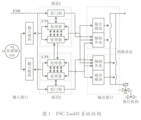 安全仪表系统本身必须具有很高的安全性。当系统检测到装置工艺变量达到或超过临界值时,必须完成安全保护动作,避免事故或危险扩大,这是它的正常功能。另一方面,安全仪表系统必须有很强的诊断功能,系统中局部故障或失效产生单点故障时,故障不会扩大并可切除或隔离;当系统中的故障足够严重(非工艺参数变量引起),如系统不能正常工作,或者因为系统中的故障导致安全仪表系统的安全完整性等级下降时,安全仪表系统将宕机,系统中独立的诊断模块(看门狗)将触发故障安全保护动作,保证系统不会因为重大仪表系统故障产生拒动的风险而失去安全性,从而保障了工艺装置的安全性。如本次改造采用霍尼韦尔SM系统集中完成全部输入逻辑处理运算和输出设备的控制,集中度高、风险高,对SIL的等级应高于输入输出。这种SIL级别的要求包括系统内部逻辑处理器的输入输出接口、处理器(CPU)、电源、总线、通信接口和软件系统,且必须是通过TUV认证的。FSC2OO4D系统结构如图1所示。控制处理器由冗余的两块CPU卡构成,每个CPU卡有两个微处理器,安全降级模式为4-2-0,正常工作时为SIL3;当一个CPU卡出现故障时,仍为SIL3;当两块都坏时,系统将宕机,故障安全保护将动作图。