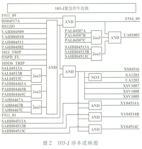 根据上述逻辑示意图,以下任意一个条件满足都会联锁103-J停车,停车信号则送至DCS(XA1203)、现场就地盘(UA01003)、辅操台(UA1203) ,以及切断三个停车电磁阀(XY04514 A/B/C)电源,使速关阀快速关闭,同时切断三个防喘振阀电磁阀(XSVl007/8/9) 电源,使阀门快速打开。